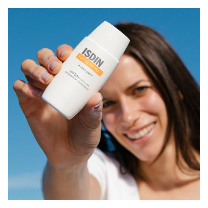 ISDIN FotoUltra 100 Active Unify confere um ecrã total anti-UV, 2 vezes superior ao exigido nos protetores com SPF50+, para proteger a pele de forma mais eficiente.